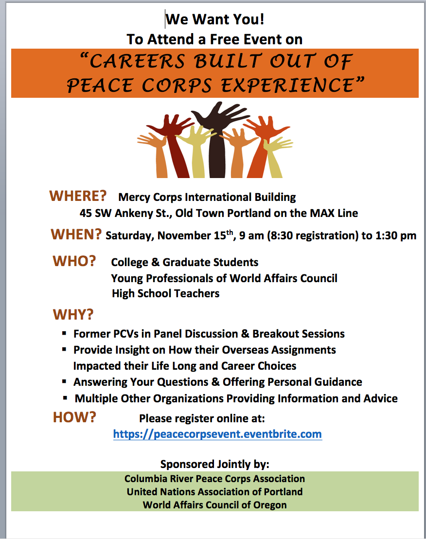 See the upcoming event jointly sponsored by the United Nations Association of Portland, the Columbia River Peace Corps Association, and the World Affairs Council of Oregon, to be held on 15 November (8:30 am to 1:30 pm) at the Mercy Corps International Building in Portland.Our aim is to bring together college students with Returned Peace Corps Volunteers to share both the Peace Corps experience as well as their follow up careers, all for the purpose of motivating students to consider Peace Corps or other volunteer service programs as a path to careers in public service, domestic or international.