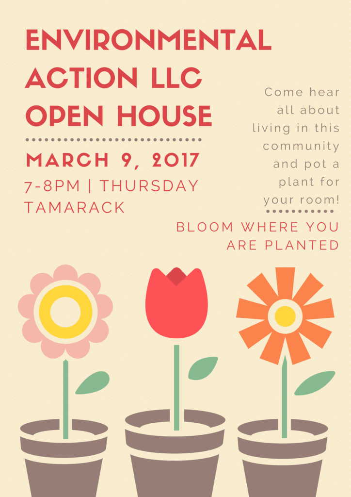 March 8, 2017 10:42 am Environmental Action LLC Open House Hello ENVS, This Thursday, March 9th from 7-8 pm, come to Tamarack to hear all about the Environmental Action Living Learning Community and pot a plant! Please see the attached flyer for details. Related