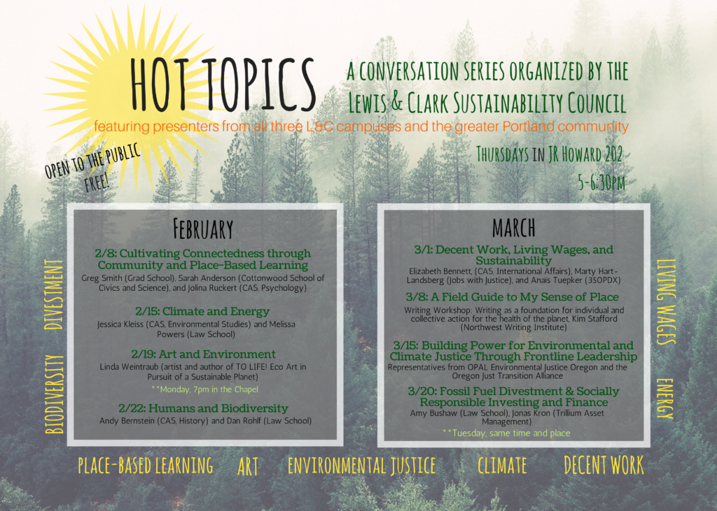 January 31, 2018 12:02 pm Lewis & Clark Sustainability Council – Hot Topics: a conversation series Please join the Sustainability Council in their Conversation Series. Related