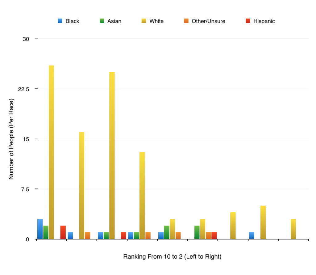 This graph is the ranking of importance on the scale of 10 to 1 by the number of people per race/ethnicity. The tick mark on the very left of the graph on the x-axis is the highest ranking of importance with the tick mark on the very right of the x-axis being of lowest ranking. Each color represents a certain race/ethnicity and the each bar shows how many people of that race/ethnicity voted for a certain number in ranking.