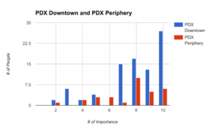 Most of the data that was gathered within the city of Portland, whether it was downtown or the periphery, can not actually be used for this particular study. Although the responses may correlate, the data is skewed due to the fact that Portland is a predominantly white city (around more than 75% of the population being white with the rest being minorities). Since the data is skewed, the data is not accurately portraying whether race affects who believe in the importance.