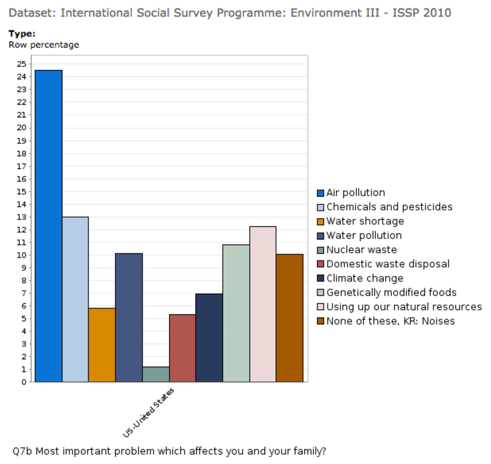 The International Social Survey Program surveyed the American people’s opinions to the following two questions: what is the “Most important problem for [the country] as a whole?” and what is the “Most important problem which affects you and your family?” (See Figures 8 and 7). The two included options span from “domestic waste disposal” to “genetically modified foods”. Yet the most popular answer for the country-wide survey question was “using up our natural resources” (See Figure 8), whereas the most common answer for the personal-based question was “air pollution” (See Figure 7). The lack of similarity between these two spectrums suggests a difference in opinion of the well-being of one’s country versus one’s family. Regardless, climate change ranked 4th and 7th respectively for each. We figured this to be an interesting result considering that the issues of natural resource use and air pollution contribute to the overall problem of climate change. Perhaps it was part of the intent of the survey authors to see how much of a disconnect there existed in the minds of American citizens when comparing the concept of climate change to other seemingly separate environmental issues. This additional 2010 data again sharply contrasts that of the more current Pew Research Center survey and of our Portland survey. Most Portlanders saw climate change as near the top of their list of national priorities, rather than below other environmental concerns.