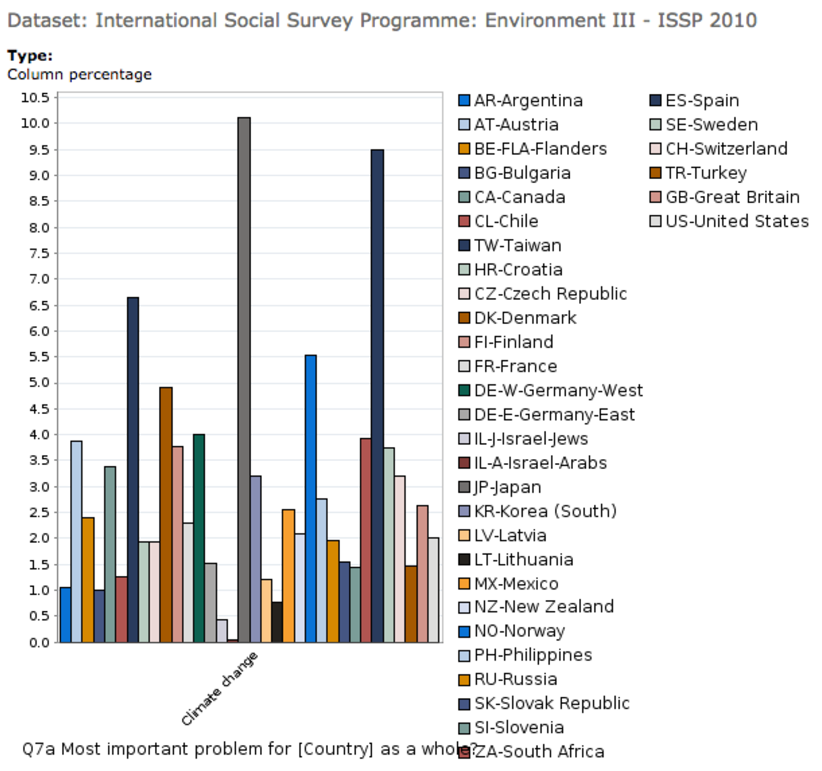 Several similarities can be observed when comparing the data that we gathered in the Portland area to that of the cross-national surveys conducted by the 2010 International Social Survey Program. For example, when asked “what the most important problem that affects you and your family was” surveyed individuals in more developed countries, such as Spain and Japan, claimed that climate change ranked higher on their list of concern; while less developed countries did not hold environmental issues with such high regards (See Figure 9). A similar distribution of answers was gathered when asked if climate change was the “most important problem for [the country] as a whole” with Spain and Japan again claiming that they valued climate change over most other issues (See Figure 10). However, it is interesting to note that, in relation to these standings, the United States ranked below a 2 on a 10 point scale for both of these questions. This being the case, each of these surveys were taken in 2010 allowing for some changes in public opinion in the last seven years. These demographic differences and the responses that accompany them can be easily seen as similar to the data gathered in the Portland area. Perhaps a similar ideology is shared between those in nations that regard climate change higher than most other issues (e.g., Spain and Japan) and the liberal Pacific Northwest.