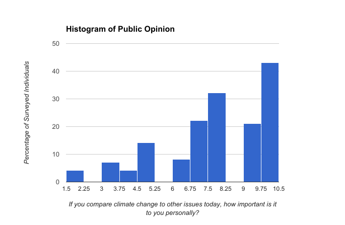 Over the process of creating this report, we have been surprised by many factors. One example would be that of the many negative responses we encountered when conducting the survey downtown. We assumed that the majority if not all of the responses we received would have favored interest in climate change. Another surprising aspect we encountered was the fact that national surveys ranked aspects of climate change (e.g., air pollution, overconsumption of natural resources, etc.) higher than climate change itself. Finally, we were taken aback by the incredibly low ranking of the United States in the 2010 comparison to other countries regarding their standings on climate change importance. Despite our country’s high fossil fuel consumption, we seem to lack interest in its repercussions. In conjunction with these discoveries, we found that there existed a gray area in public opinion of climate change throughout this project; it goes to show how disagreement is very prominent in climate change discussions. This idea, of course, is not a new one for us as many of these themes have been explored in Mike Hulme’s book, Why We Disagree About Climate Change, within the complicated dimensions of science, politics, economics, religion, and media. We are now more reinforced in our understanding that climate change is indeed a complicated issue that yields debate from a large pool of differing perspectives and ideologies.
