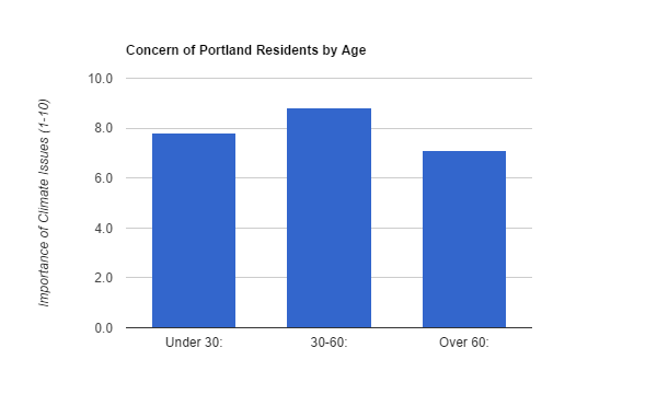 Majority of the people the class surveyed were under the age of 30. This could be due to being in the urban setting of Portland with a large population. Surprisingly though, the largest group that was surveyed only came in second compared to how concerned they are when it comes to climate change. Instead of the younger population being most worried about climatic changes even though they have grown up having access to the best knowledge about climate change, the age group of 30-60 had the most concern with an average of over 8, while both under 30 and over 60 were below 8. Even though as surprising as it is, the age group of 30-60 have more concerns about the future possibly because of their children, a possible aspect that raises the concern of climate change in that age group.