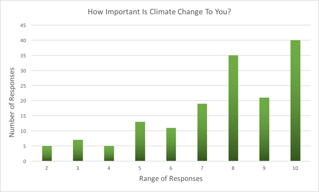 We discovered a wide range of responses to the question of how important climate change is, ranging from 2-10. Figure 1 demonstrates the distribution of responses, with frequency generally increasing as you move towards a higher level of concern. It’s interesting to note that 10 was the most commonly chosen response, indicating that a significant portion (26%) of our population believes that climate change is one of the most important issues of our time. A mean of 7.6 combined with a standard deviation of 2.2 indicates that 68% of those surveyed placed their level of concern between 5.4 and 9.8 out of ten.
