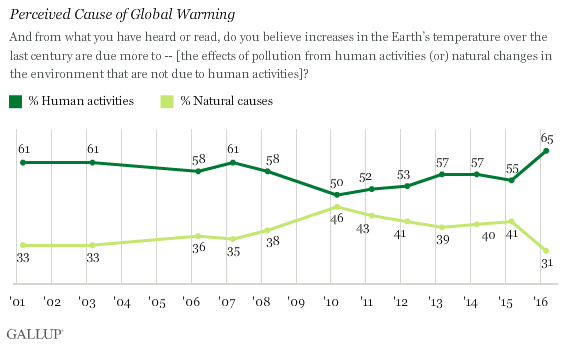 In relation to the cause of climate change the data collected from 2001 to 2016 indicates a steady increase in the opinion that human activities contribute to climate change. In 2001 61% of respondents felt that climate change was influenced by human activities. By 2016 that figure was up to 65%.