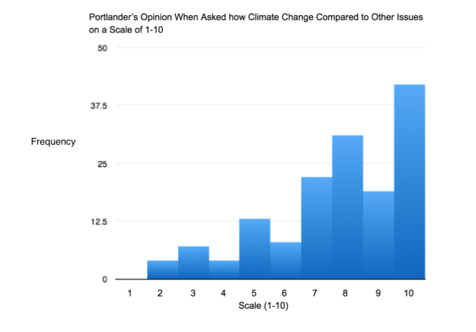 For this assignment, we went to downtown Portland to discuss the issue of climate change with a few locals. We went downtown into Powell’s Bookstore Cafe to find some willing participants. Though it was tricky to get people to take time out of their busy days to help out a few college students with a survey, the four people we interviewed highlighted the importance of addressing climate change because of the recent election, its connection to many other issues, and its urgency. We asked them how they compare climate change to other issues today on a scale of one to ten, and followed up with asking them more about their thoughts on climate change. We also took note of their perceived age, gender, and ethnicity. We tried to be as unbiased as possible when picking people to ask to complete the survey, but obviously we were limited to willing participants. After collecting our data we compared it to the data from our classmates and then formed our statistics. With these statistics we were able to compare them to national data and draw conclusions.