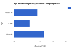 When looking at Figs. 4 and 5, we can see that those under 30 and those over 60 appear to have marked climate change as being more significant to them on average than the middle aged Portland community. This is surprising, considering how the elderly tend to be more conservative in the United States (2014), but we may not have surveyed enough people to get a full idea on the opinion of the elderly in Portland (only 15 people over the age of 60 were surveyed). The result of the youth, however, is roughly similar to the average of the men and women surveyed, which may be because the highest number of people surveyed were under 30 (80 youth surveyed).