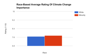 When looking at Figs. 6 and 7, it is hard to truly gauge the opinions of the minorities compared to those of white people. Our class only interviewed 17 people of color, and with Portland being one of the whitest cities in the country (2016), it is challenging to get the opinions on climate change from those of a variety of diverse backgrounds and cultures in the city. However, it does appear based on our survey that minorities tend to rate climate change as being of slightly higher importance on average than white people do, but again, this may be discounted considering the large number of white people surveyed and the small number of minorities surveyed skewing our results.