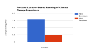 When looking at Figs. 8 and 9, the people in downtown Portland had a heavier distribution of ratings towards the higher end of the scale. This resulted in the average being 7.5, whereas in the Portland periphery the average was 5.8, This is the most significant difference observed by us of (1.8 ranking difference) between two or more compared categories. This lower rating in the Portland periphery may be because of the fact that more people voted conservative in the 2016 elections in those areas than they did downtown (2016), and conservatives may be more inclined to listen to the Trump Administration declaring climate change fake and not important to the country. However, like the comparison among races, this data may be discounted, because far more people were surveyed downtown (80 people) than in the periphery of Portland (23 people).