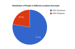 Figure 9: Circle graph comparing the number of people surveyed in downtown Portland (80) vs. the number of people surveyed in the periphery of Portland (23).