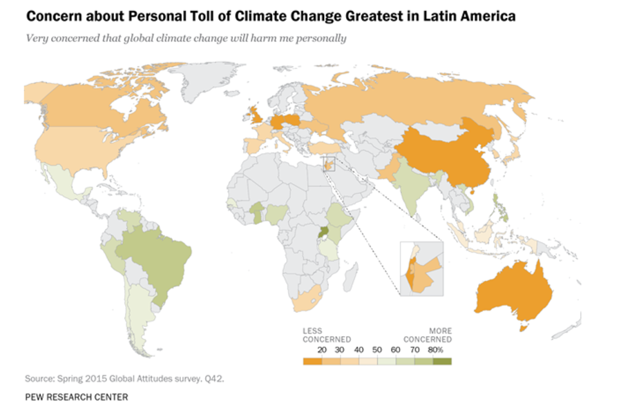 Compared to international data collected by Pew Research Center about how much people personally care about Climate Change, it seems like Portland contains a higher percentage of people that believe it is a serious issue than is estimated of the world’s population. According to a survey done by FactTank in Spring of 2015, of 40 different nations polled around the world only 54% of people think climate change is a serious issue. In Portland, 64% of people rate the threat of climate change as an 8 or higher. This is probably due to the demographic that Portland attracts. Many people living in Portland, especially in the areas where people were surveyed, express concern for the environment. Internationally, countries with the highest per-capita levels of CO2 emissions are less concerned about climate change. Although Portland has a relatively high level of per-capita CO2 emissions, they have less than other cities due to environmentally concerned citizens who chose to use more sustainable modes of transportation, yet Portland still has a higher percentage of concerned citizens.