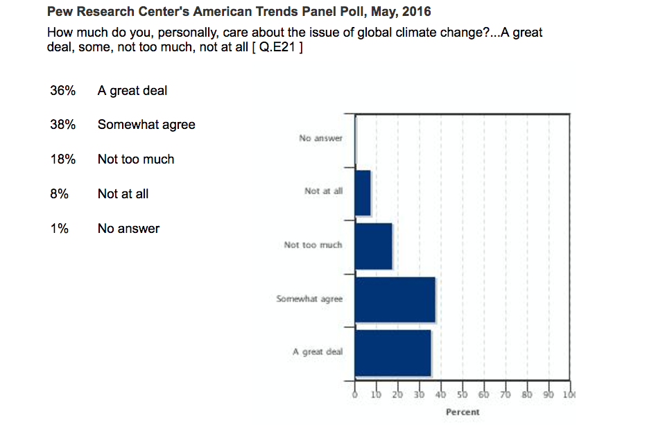 When looking at National surveys conducted by the Pew Research Center asking questions of Climate Change importance, results showed that across the US, Americans say they consider changes in the environment ‘a very big problem’ or ‘a great deal’.