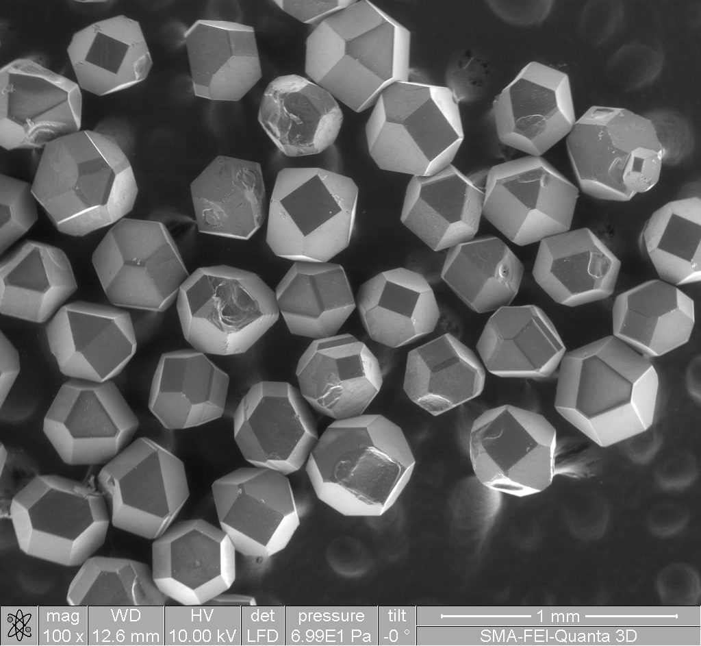 To produce synthetic diamonds, small diamond seeds on a tray are exposed to ultra-pure carbon gases, among others, inside a temperature regulated, high-pressure gas chamber. As the gases excite, carbon begins to rain from the ceiling of the chamber. Slowly, the seeds grow until they are the desired thickness, a process that can take less than a month. The technicians remove the fully formed diamond crystals, and use laser cutters to shape them for industrial use. Synthetic diamonds are chemically, visually, and physically the same as naturally occurring diamonds. Additionally, as they are one of the hardest surfaces known to man, they make a great industrial tool for cutting, sanding, or sharpening very hard materials, including other diamonds (ScioDiamonds).