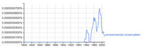 Figure 1: Google Ngram Viewer for the phrase environmental conservatism in literature. (“Google Ngram Viewer” 2017)
