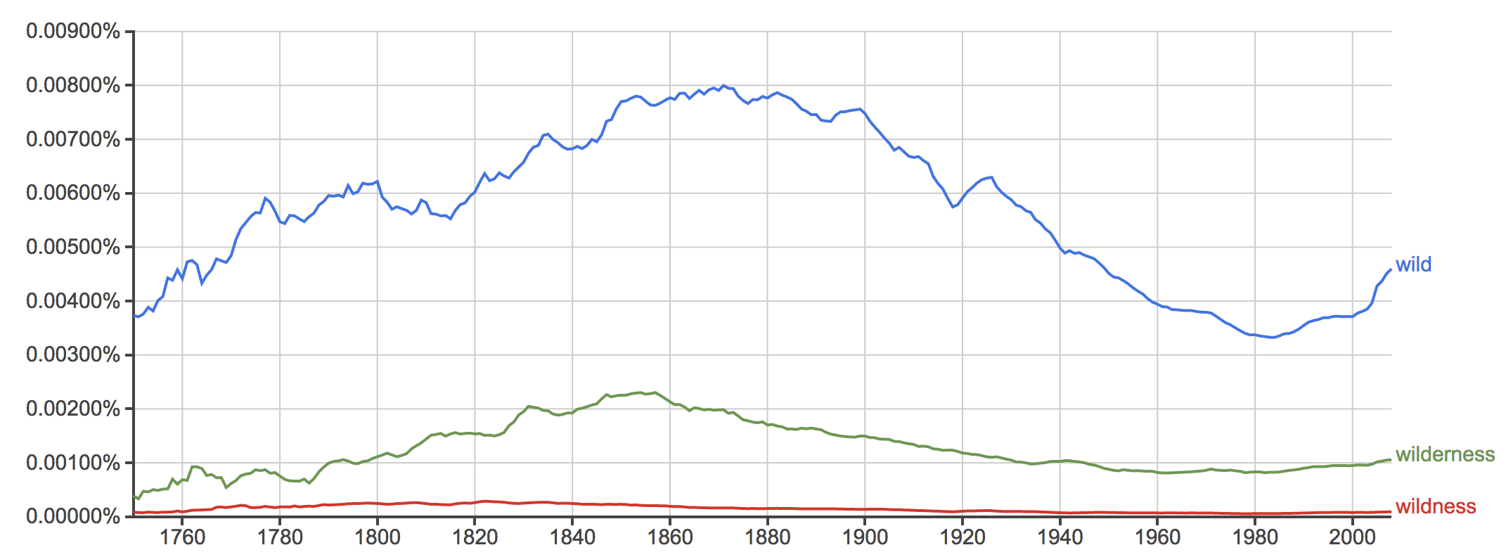 Wildness as a literary concept dates as far back as the 16th century in early American history (See Figure 1). But the term gained popularity during the 19th century in conjunction with the similar—and more common—concepts of “wild” and “wilderness” and then reached its peak in American literature in 1822. Before this time, the idea of wilderness held extremely negative connotations with danger and the unknown or was dismissed entirely (Condition and Trends Working Group 2011). Yet 1822 marks a period near the proliferation of American Romanticism, a literary thought movement that captured the nations imagination with emphasis on emotion and individualism in light of a rapidly industrializing urban landscape. Urban residents experienced higher levels of stress as a result of their developing surroundings in relation to air and water pollution along with social situations such as unemployment and poverty. Residents felt nostalgic for a more clean, pristine atmosphere free of the toxins and worries of urban living. Consequently, the notion of wilderness triumphed, even to levels beyond physical appreciation (Condition and Trends Working Group 2011).