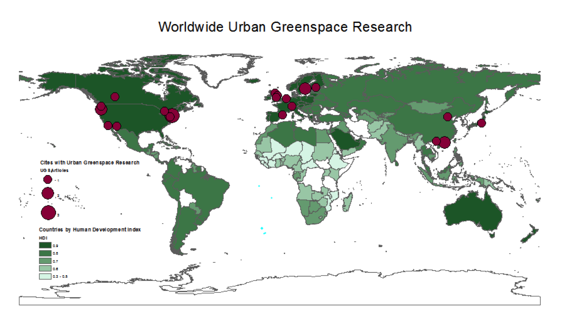 Figure 2: Cities with Situated Urban Green Space Research and Countries with the highest level of Human Development
