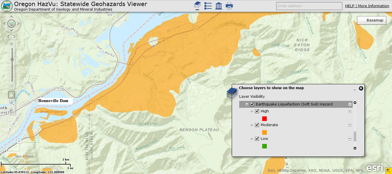 Liquefaction, the event of loosely packed and moist sediments act as a liquid substance, can occur during the intense shaking of an earthquake. The liquefaction hazard for the area adjacent to the Bonneville Dam on the Oregon side as well as on Bradford Island is moderate. Buildings and infrastructure, such as the visitors center, are sitting on these soft soils and are likely to be severely damaged in an earthquake if liquefaction does occur.