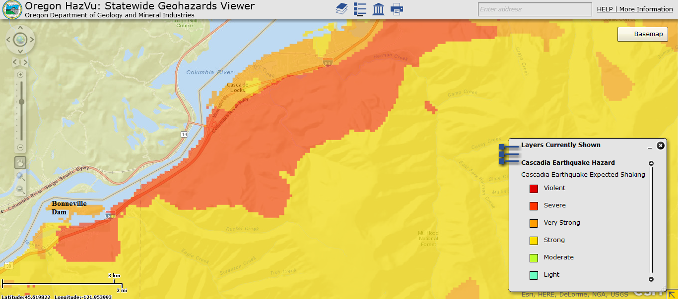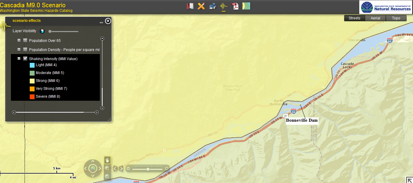 This map shows the expected shaking of the area surrounding the Bonneville Dam in the scenario of a 9.0 Cascadia event. Directly to the south of the dam on the Oregon side, the slope as a rating of “severe” shaking, as does a large swath of the slope just upstream from the dam. Although the Oregon data does not explain the specific force behind the shaking ratings, the stronger the shaking indicates the higher probability of structural damage. Bradford Island itself, where the Bonneville Lock & Dam visitor center is located along with other structural aspects of the locks, dam, hydropower, and fish ladder systems, is predicted to have “very strong” shaking.