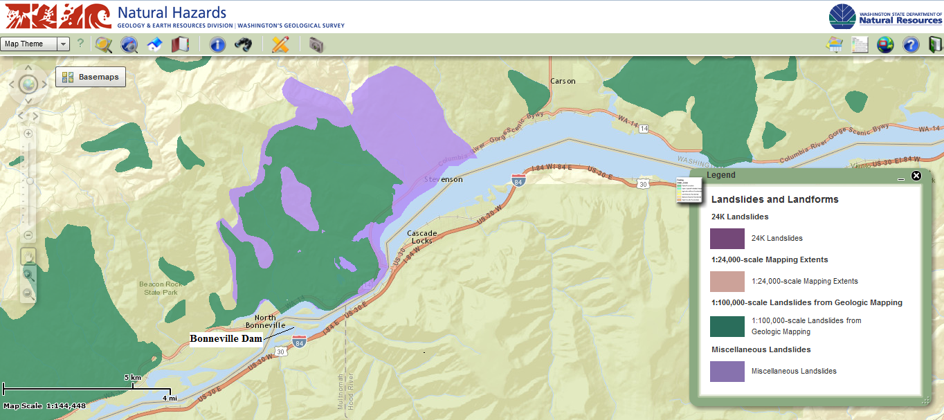 On the Washington side of the river, two landslide features dominate the area adjacent to the Bonneville Dam. The green shape is a collection of mass-wasting deposits, mostly landslides, from the current geologic period (Quarternary). The purple shape is the Bonneville Landslide, a deep-seated historic landslide that is currently being researched by the Washington Division of Geology and Earth Resources. Both of these preexisting landslides are areas of liquefaction susceptibility, and if they are measured in the same or similar way that Oregon landslides are, it’s likely that they would be rated “very high” in earthquake susceptibility.