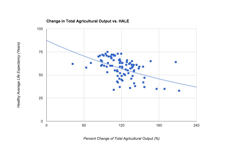 The question we attempted to answer was, how is the healthy average life expectancy affected by the increase or decrease of a country’s agricultural output. Because the NET agricultural output is measured in percentage compared to previous years out of 100 (ie. 110 is equal to a 10% increase), and the HALE is measured by expected years, we were able to see if increasing agricultural production affects local lifestyles in a definitive way. We predicted that these changes to come from pesticide and herbicide use, economic changes, and many other environmental and social shifts that follow agricultural production.