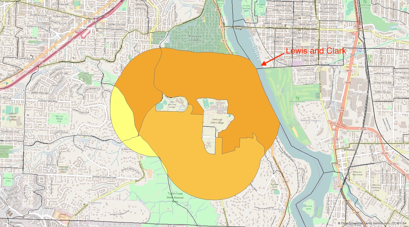 For example, Lewis and Clark’s surrounding communities seems to be a combination of fairly wealthy home-owners and low-income college student renters. The ratio is significant enough to see where most students are living (north of the campus), yet the color scheme of this map is very different from downtown campuses. It is also important to note that polygons in questions are much larger and fewer than other campuses, which means the number of residents, or total population, is also fewer than downtown. This is important to note in the projected number of residents that would most-likely come to this school. It is also important to not that it is unlikely to have many other resources for community members in a secluded community like the one near Lewis and Clark.