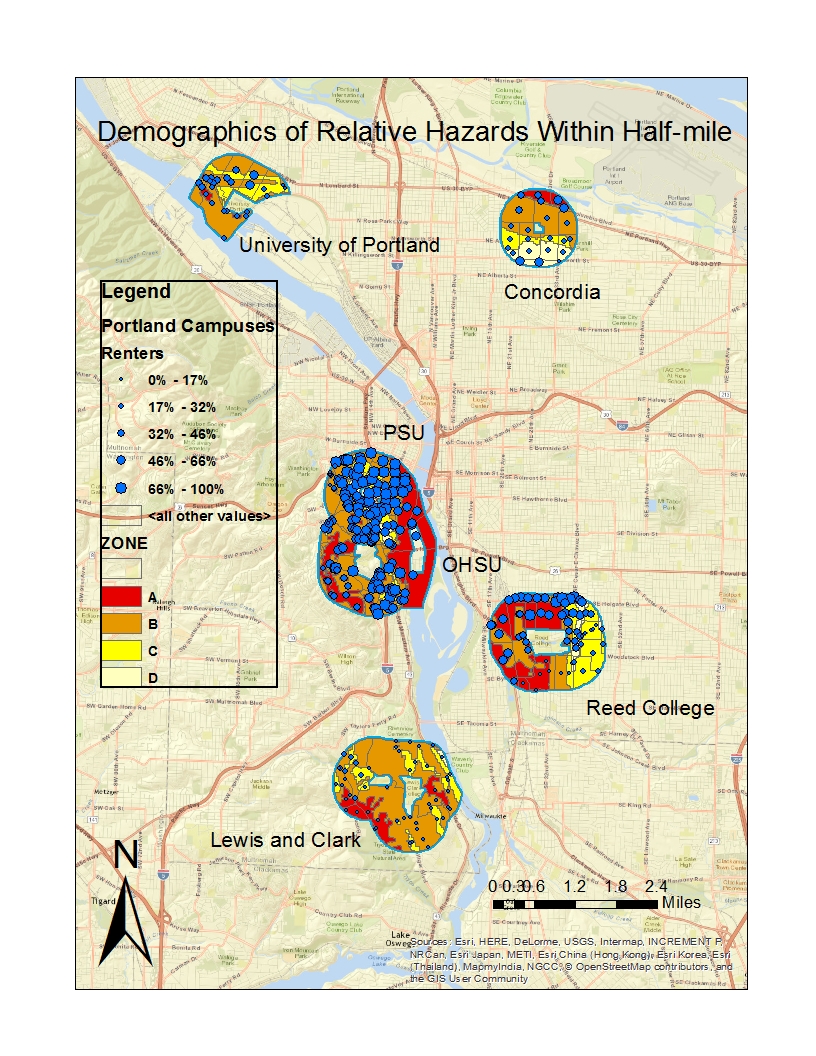 Figure 1. ArcGIS map of Concordia, UP, PSU, OHSU, Reed, and L&C. Includes hazard zones and renter distribution. Hazard zone A is most hazardous, zone D is least hazardous.