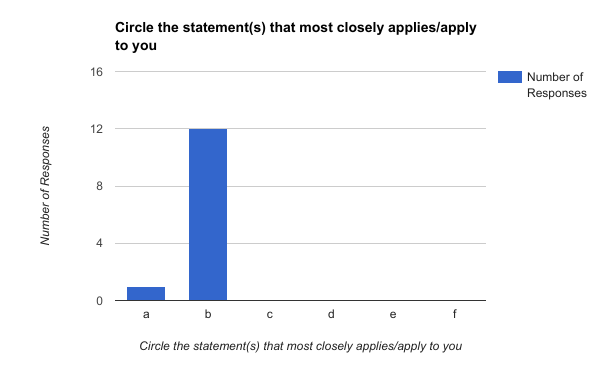 In question 6, we had a clear takeaway from the clinic in light of how people saw themselves after the event. In Figure 2, we see that all the attendees answered statement B (There are things I can do to lessen the impacts of this event and prepare for its aftermath) to the question. However one person did mark statement A (I feel overwhelmed by the prospect of this earthquake and don’t know what to do next) as well. In context to the PADM, this could be seen as the majority of participants possessing the efficacy to take protective action (Lindell & Perry, 2012). Their perception of the threat has elements of what they can do to begin danger-control processes (Witte 1992).