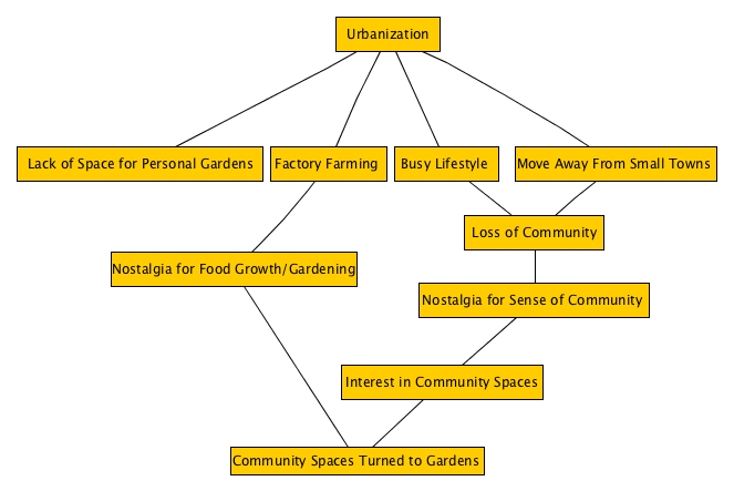 Through reading literature on urban community gardens, we created an actor network map outlining some pertinent factors that have led into their creation and implementation. Starting with urbanization as the overarching driving factor behind urban community gardens, there are multiple reasons, including a sense of nostalgia for a pre-urban way of life, that create the drive behind urban community gardens.