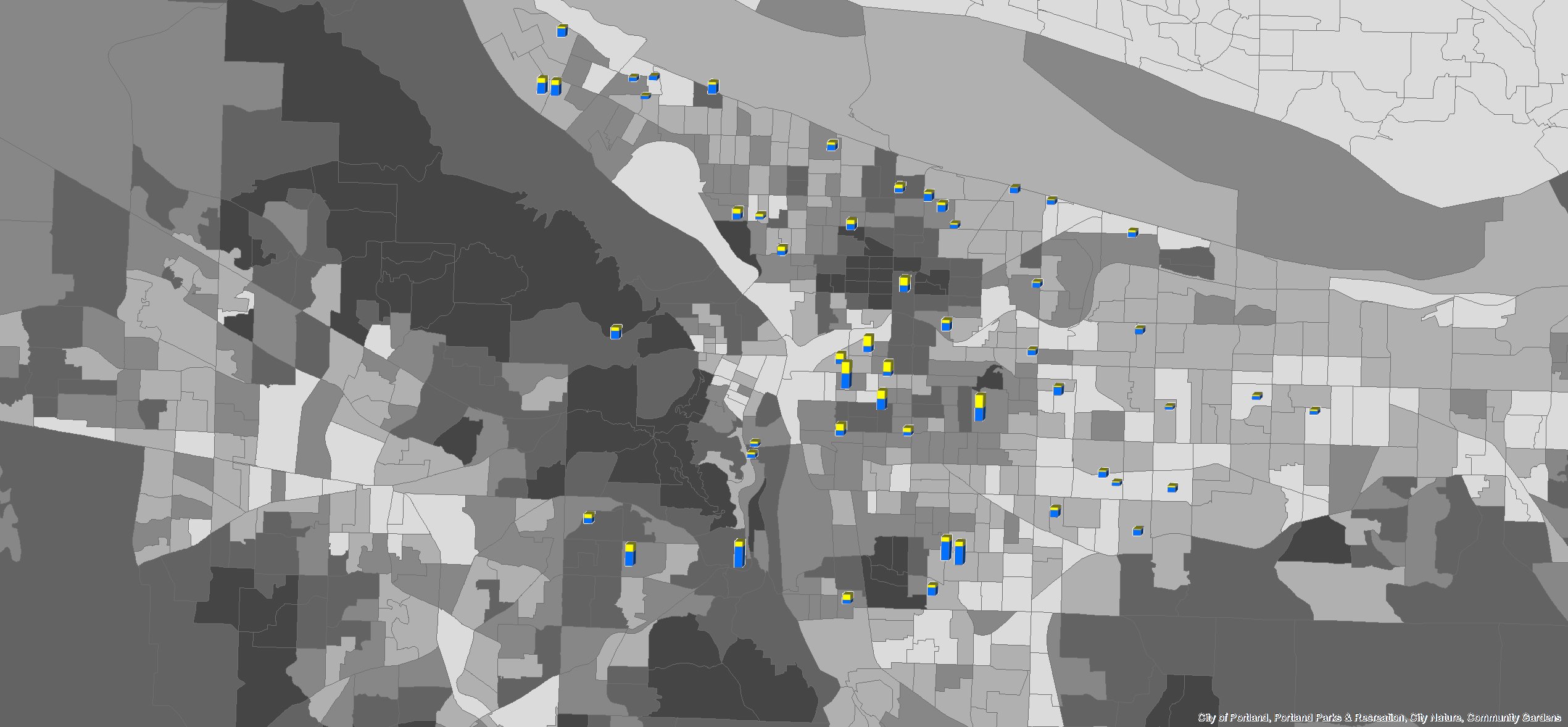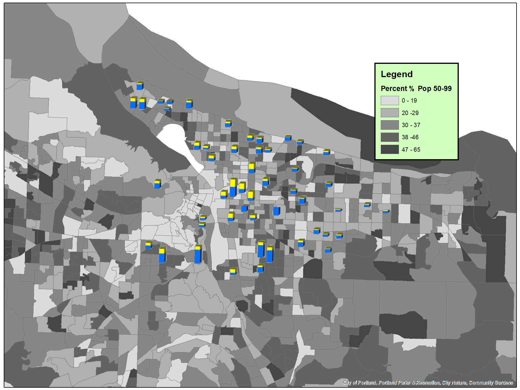 Two results of interest are the Pearson-Correlation for income levels >100 and <49 thousand $/yr. They show positive correlations between the percentage of a Portland neighborhood with high (>$100k/yr) income and the presence/interest in garden plots. Alternatively, there is a negative correlation between the percentage of a Portland neighborhood with low (<$49k/yr) income and the presence/interest in garden plots. Lastly, there is no strong correlation for the middle income bracket. Conceptually then, the presence/interest of garden plots has a positive correlation with the presence of higher income households.