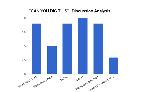 This chart depicts various quotations we gathered from the discussion after the film screening of CAN “YOU DIG THIS” directed by Delila Vallot. These quotations are from four individuals who spoke on a panel after the film screening. We created four classifications to dissect these quotations: opinion on the feasibility of gardening for low income individuals, local applicability of the quotation, global applicability of the quotation, and opinion on whether gardening can save the world’s problems. This enabled us to explore the topics in the quotations further, both visually and numerically.
