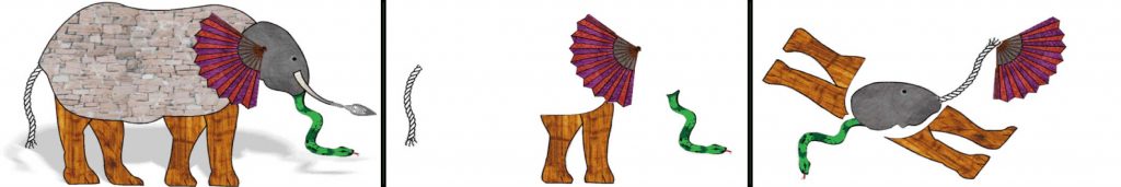 One illustration of interdisciplinarity draws upon the famous south Asian tale of the blind sages and the elephant, in which each sage understands but a part of the whole. This presents two challenges for environmental scholarship (Proctor et al. 2013): inclusivity, or making sure all the parts are included, and coherence, or making sure these parts are assembled correctly. The diagrams* below, reflecting this famous tale, suggest what would result if we don’t pay attention to both.