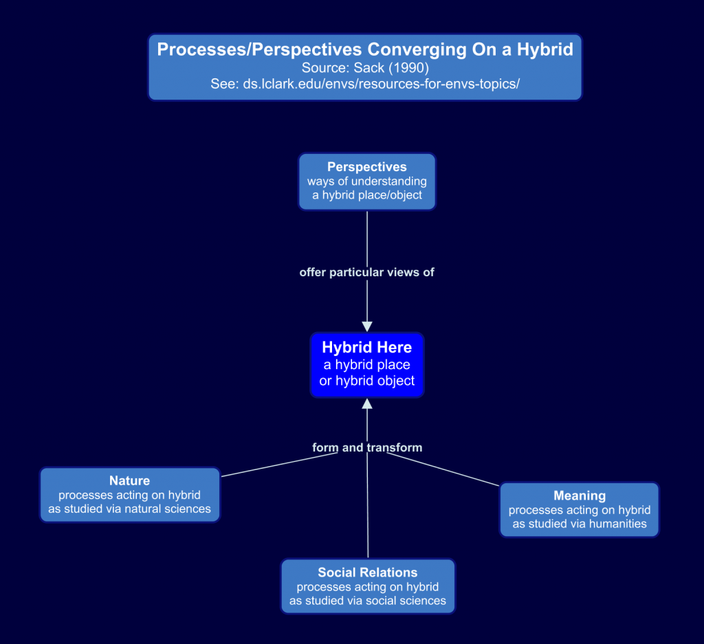 Hybrid object/place If you are considering a hybrid (object) or place, the three categories of processes above, plus one or more perspectives, broadly come together as in this diagram (or see Sack’s original diagram). A hybrid object may be a general topic listed under hybrids in our ENVS topics glossary [archived site resource], or may be a specific object—we once used the text Environment & Society for ENVS, which introduced a wide range of hybrid objects ranging from lawns to wolves. A place, as suggested via Sack (1992; see also Proctor 2016) is inherently hybrid, as it gathers processes and perspectives from a wide range of scales in space and time. (And remember that hybrid objects circulate via places!) As you’ll see in this general diagram, hybrids arise from processes of nature, social relations, and meaning, and are interpreted via one or more perspectives. Your specific object or specific place will, then, include particular processes and perspectives, acting as in this diagram. Note that this Cmap indeed has a concept in the middle: this is your hybrid object or place, then contributing topics are arrayed around and connected to it.