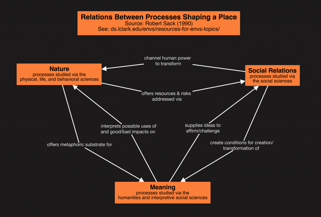 Nature, social relations, and meaning are disciplinary categories representing common divisions of scholarship into natural sciences, social sciences, and arts & humanities. As Sack’s diagram suggests, however, reality comes at us in a hybrid, mixed-up manner, where nature, social relations, and meaning mix in the situated context of particular places, and are understood via a range of perspectives.