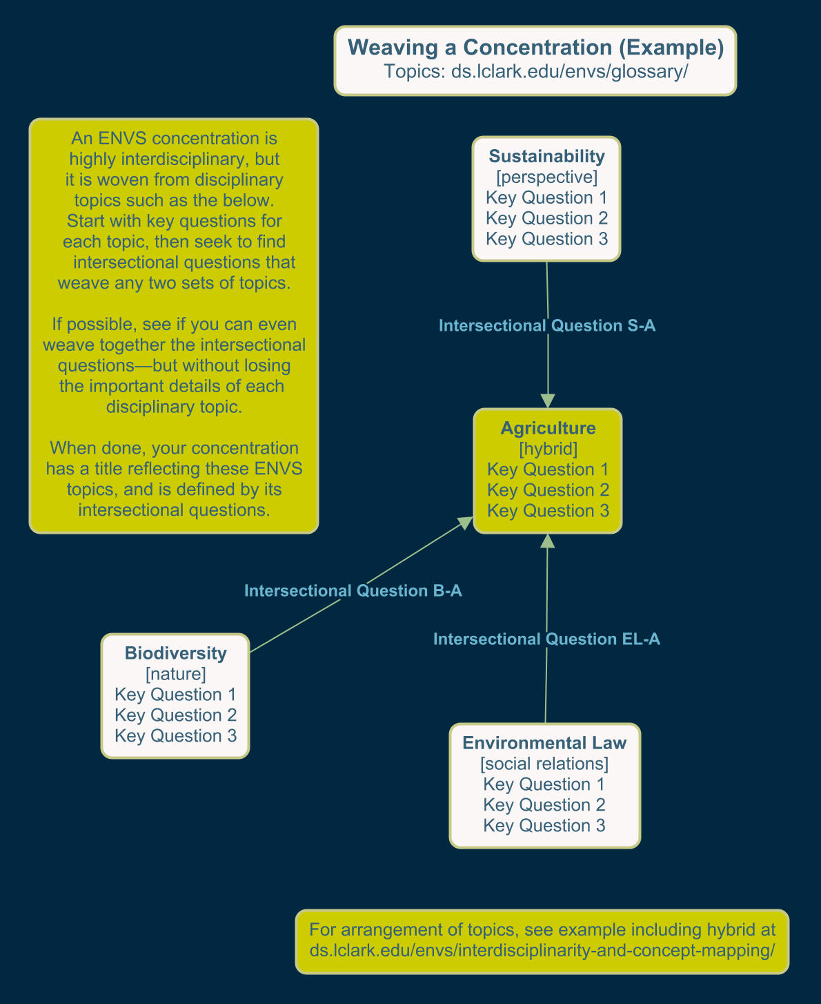In our ENVS Program we long required that students propose and defend a concentration. More broadly, you may wish to define an area of interest in your environmental scholarship. The notes below, derived from our guidance toward weaving interdisciplinary concentrations, may help you as you define your own inclusive/coherent area of interest.