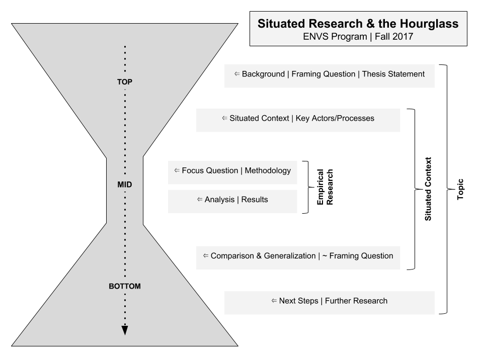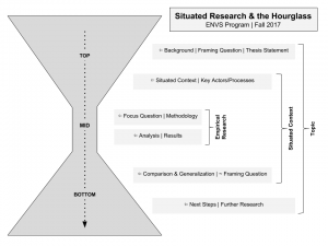 Situated research takes the rather general argument introduced here—that environmental scholarship is best grounded in the concept of place—and operationalizes it into a way of doing high-quality interdisciplinary scholarship. We summarize this for our students in the ENVS Program via what we call the hourglass.
