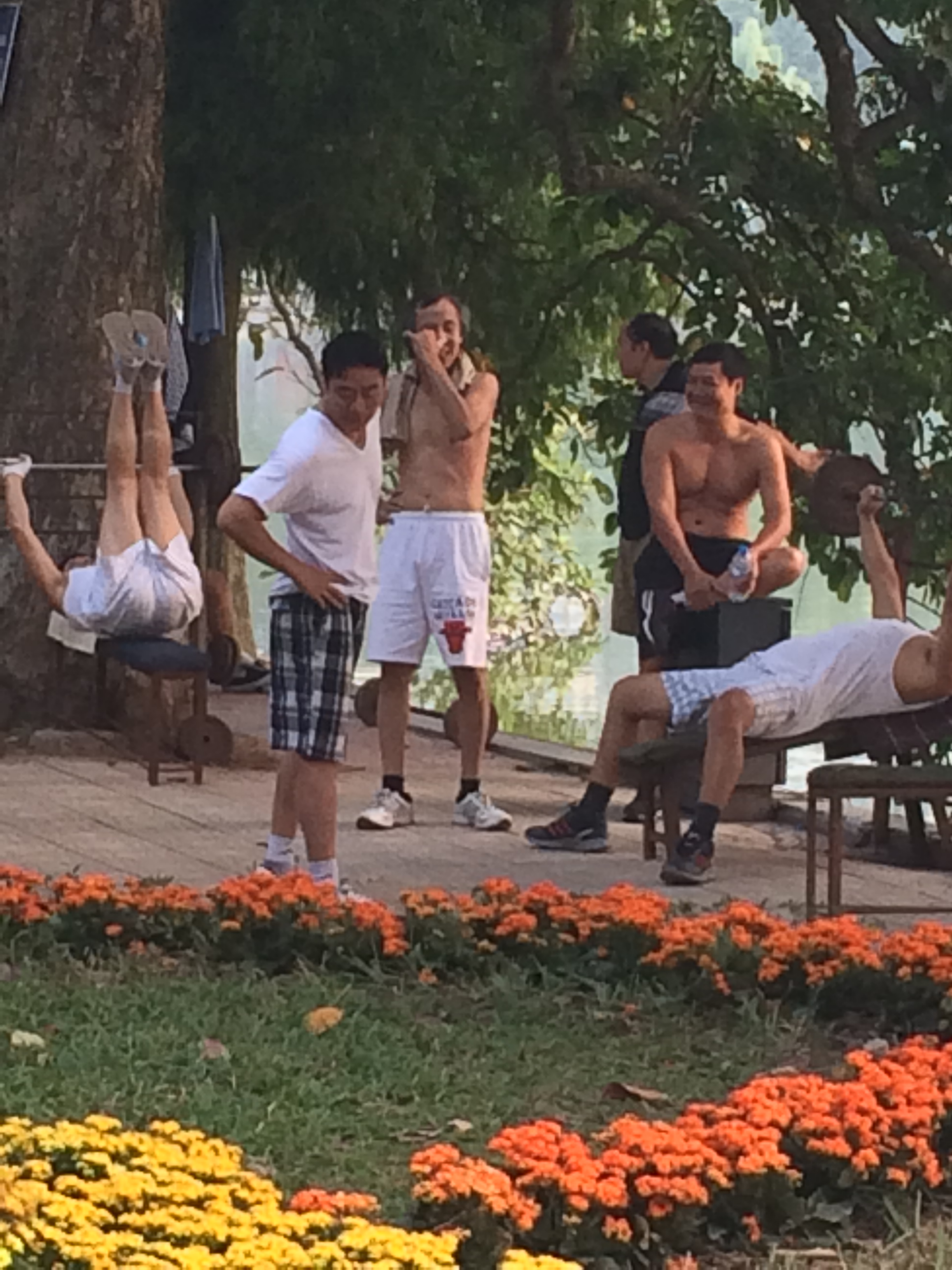 Men brought workout equipment to Hoan Kiem Park to lift.