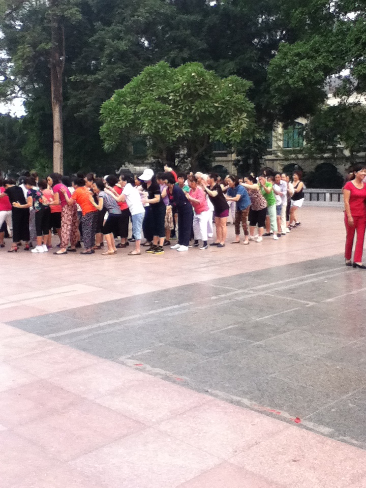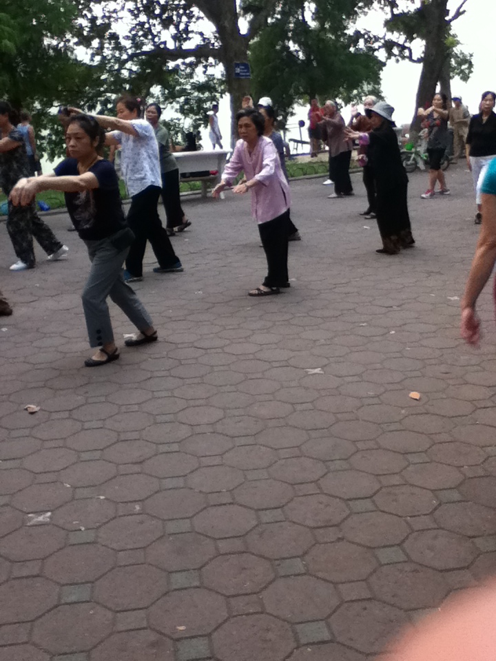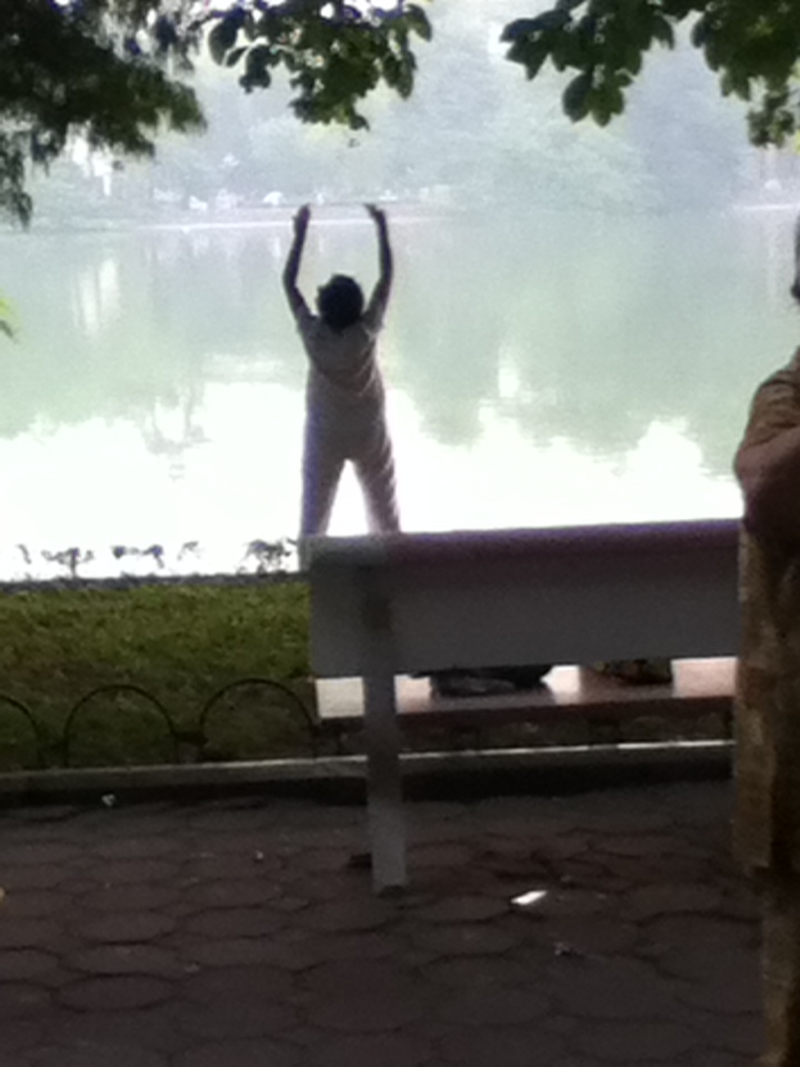 I woke up without an alarm at 5:45am and was out on the streets by 6. Hanoi is a different kind of busy early in the morning; there are markets that only exist that time of day, business men and women sitting on tiny chairs eating cháo, but easily the most entertaining spectacle are the morning exercises. In doing just one loop around Hồ Hoàn Kiếm, or Lake of the Returned Sword, I saw such a variety of stretches and workouts that I never could have imagined. There were little old ladies sitting and chatting together while doing the occasional stretch or arm slap, young and old men jogging laps around the lake, and many people doing bizarre solo workouts.