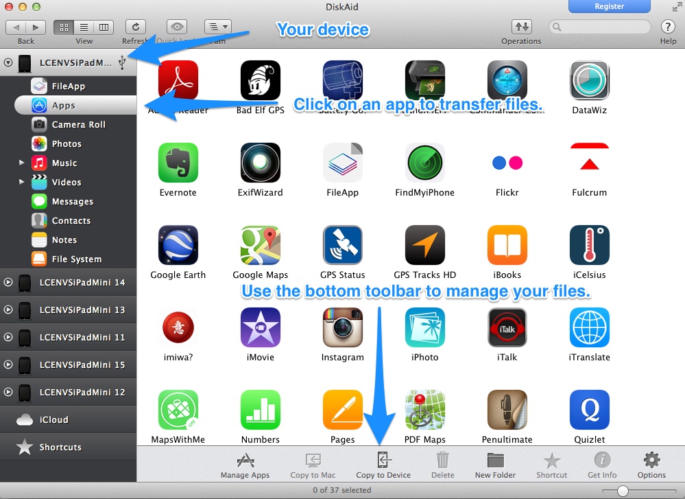 If you need a place to store files on your device that isn’t connected to an existing app, or if you simply need more functionality and flexibility with your file management system, use FileApp (located under your “Utilities” folder). You can transfer files to FileApp using DiskAid just like with any other app. FileApp can also be used to view and open Microsoft Office documents and media files.