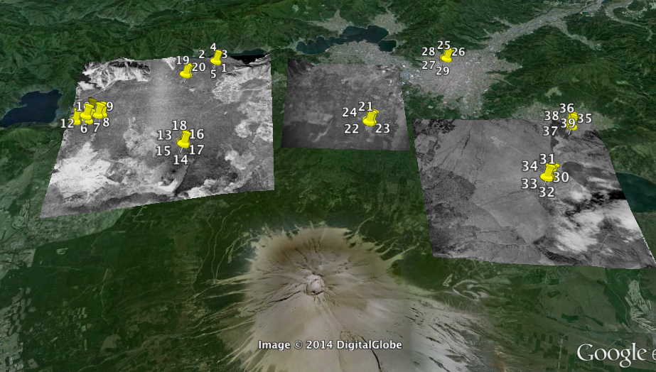 Below is a link to a KMZ file which documents our data collection over four days of historical fieldwork. The file will open in Google Earth and contains geolocated pictures documenting important findings. We used the Fulcrum Survey application to take and annotate geolocated photos while in the field, which were then exported as a KMZ file. At the end of this post is a key that explains each picture. We recommend downloading the KMZ file, as we will reference specific photos throughout this document. Within the KMZ are three historical aerial photographs overlaying each of the three lava flows that we investigated. These can be removed by unchecking the overlay files on the left side of the Google Earth window. The overlay of the Aokigahara lava flow (farthest west) is an aerial photo from 1970, the overlay of Kenmarubi (central) is from 1970, and the overlay of Takamarubi (farthest east) is from 1957.
