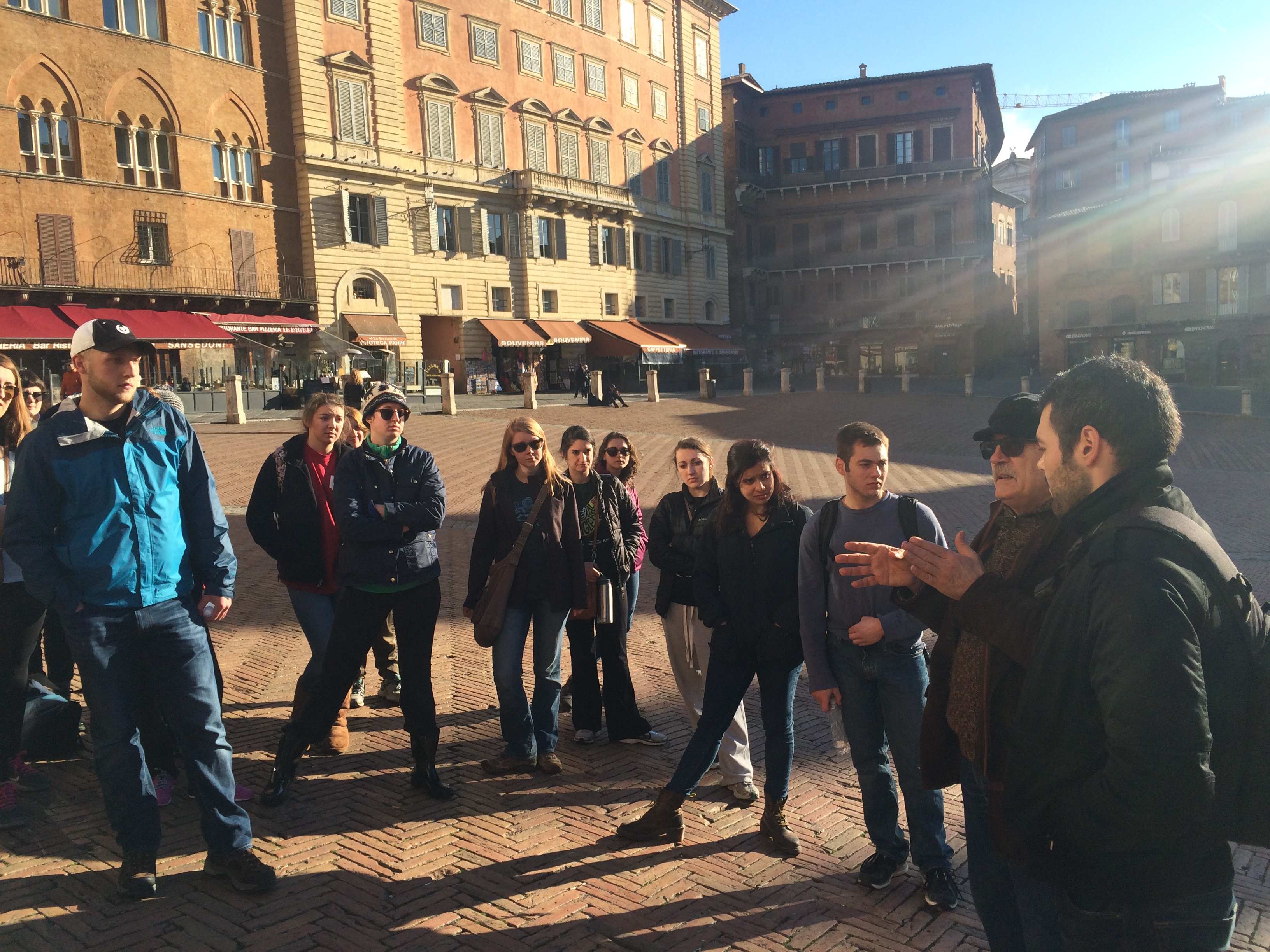 My apartment sits right above the Piazza del Campo, the huge open-air public square that serves as the civic and social center of the city. The piazza’s been called Siena’s living room, and for good reason, since at nearly all hours, I can see in the piazza high-school kids, families, old couples, tour groups, dog walkers, late-night revelers, and often my very own students (sometimes as revelers). It’s common to sit down on the piazza’s brick slope, to eat lunch, to talk with friends, to drink some wine (there are no open-container laws here). Even today, partly cloudy and somewhat cold at 5:30pm, I see amid the many people cutting through the piazza groups of twos and threes sitting all around, most in front of the small temporary wooden building set up recently in a corner of the piazza to sell the Easter dessert of struffoli (fried dough balls, four for a Euro).