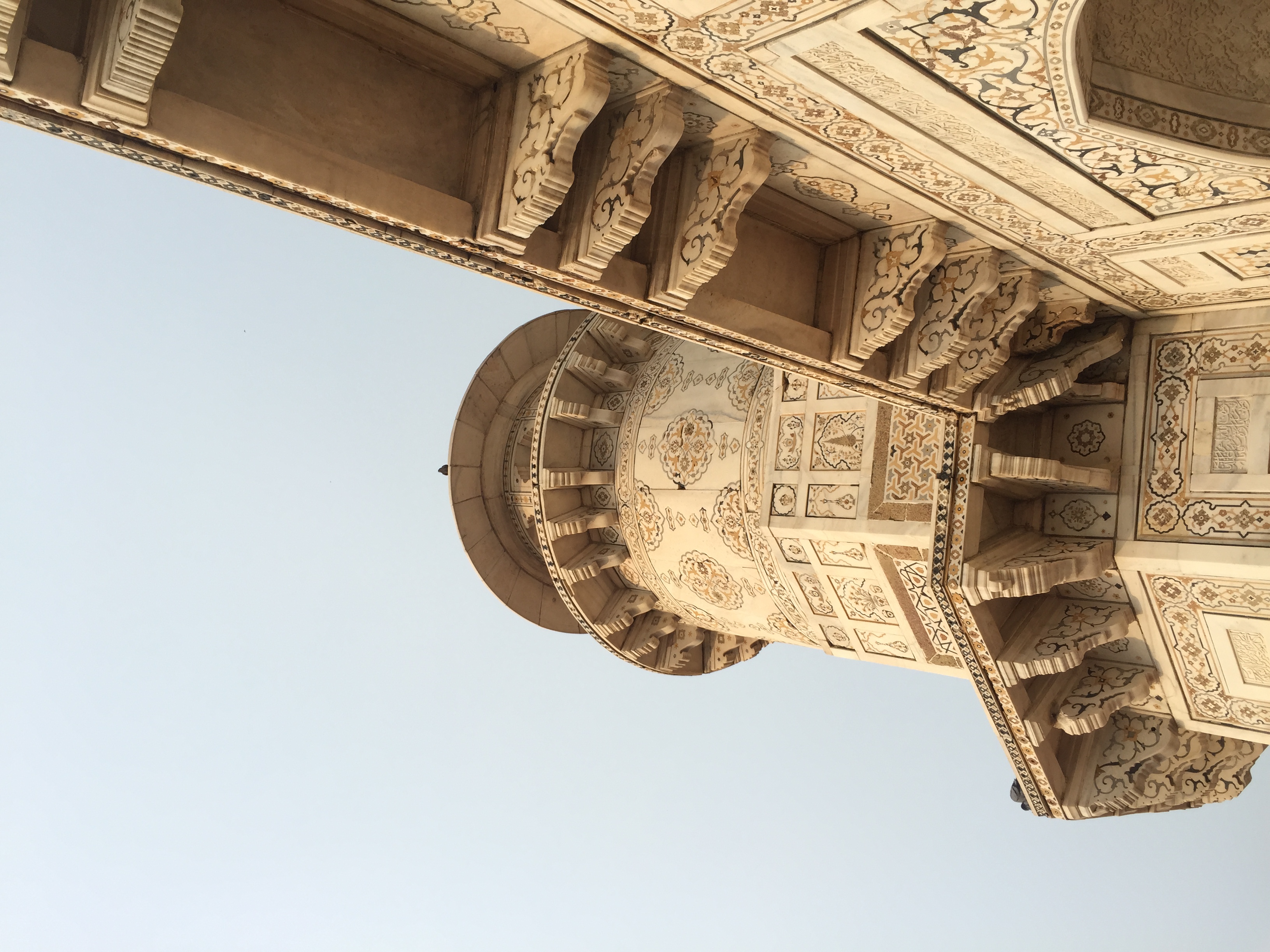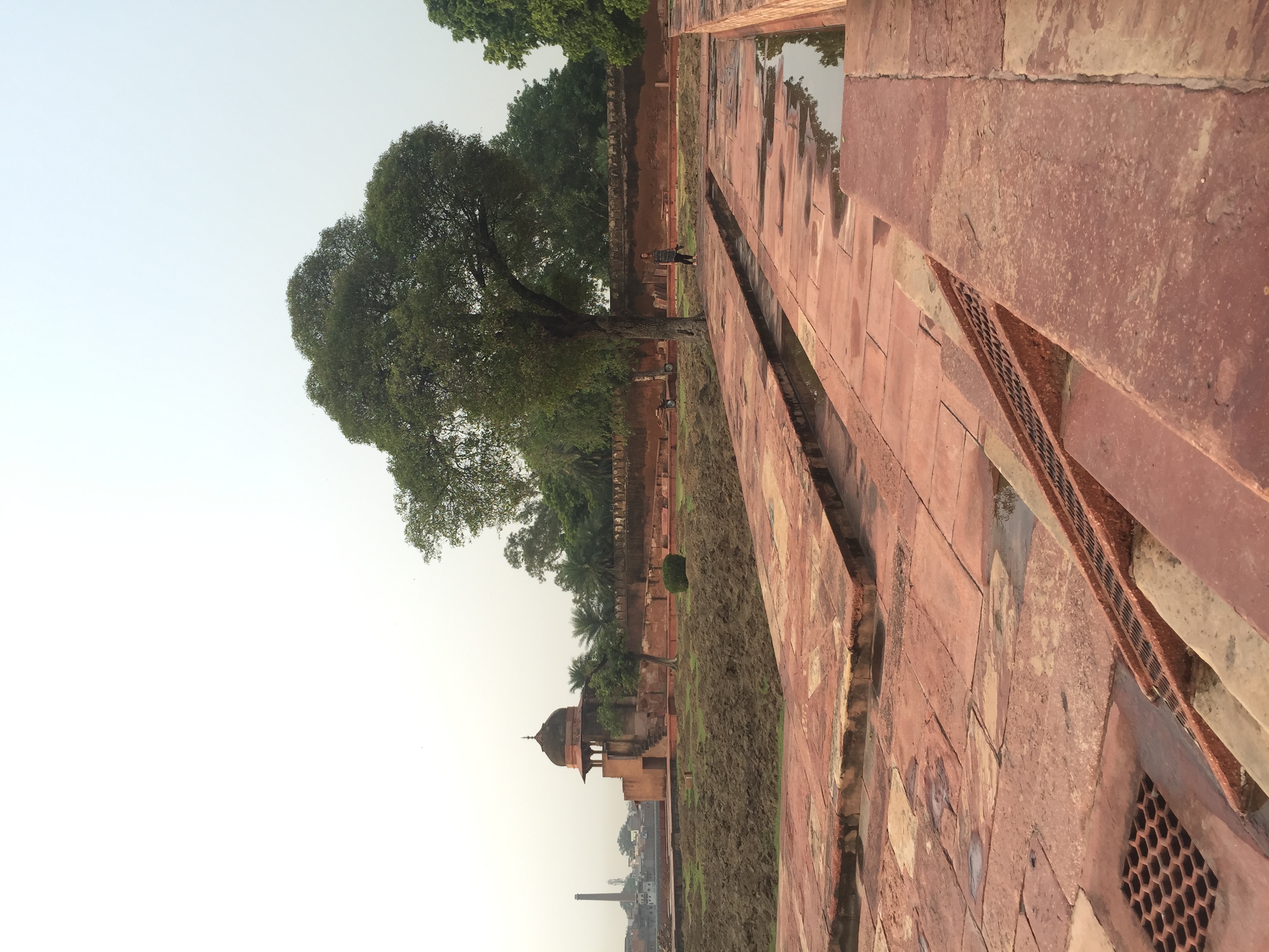 We are standing at the site of I’timād-ud-Daulah’s tomb in Agra. Beautiful pietra dura marble buildings reside in the center of the site on raised platforms, surrounded by large walls of red sandstone. Water trenches extend around the tombs, and tall trees offer umbrellas of shade. I’m aware that the Yamuna River is just yards away below the site, but I don’t scrutinize the larger space of the tomb’s surroundings. I step over some running water and meet a group of students standing by Sunil. I’m not sure how the conversation started, but at some point Sunil posed the question, “At what point did this Agra stop?” He pointed to the ornate structure just inches away from his fingertips and continued, “And turn into that?” His outstretched arm glided over and hovered just above the Yamuna, and I saw he was gesturing to the smoggy, congested city along the horizon. Someone mentioned modernization, but Sunil pressed for more thoughtfulness than that by suggesting (somewhat humorously, or maybe to start turning our brain gears) that perhaps there were just not enough important people to create embellished tombs for. Or, he posed again, had individuals forgotten their history and settled with the concept that India’s history is the present?