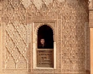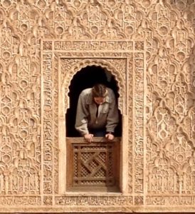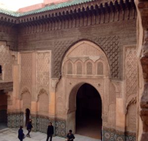 Our last stop was the Madrassa (school) Ali ben Yusuf, a 15th century Quranic learning center. It’s very hard to describe the feeling one gets looking up at intricately carved cedar cupolas and wooden lattices, or looking across at each other popping out of what were the upstairs student “dorm” rooms. On the ground level, we were surrounded by Hispano-Moresque zellij (five- colored mosaics) and carved Iraqi stucco with intertwined letters, leaves, and shells… Breathtaking.