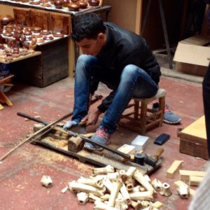A very interesting stop while making our way through the medina was at a fondouq – a location where since medieval times Marrakshis have checked into rooming houses and worked in artisan studios, sold their wares, etc. In the photo you see the son of the artisan who currently makes prayer beads for King Mohammed VI. He demonstrated the technique for us using the bones piled near his feet, and later made us each a wooden necklace.