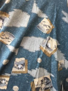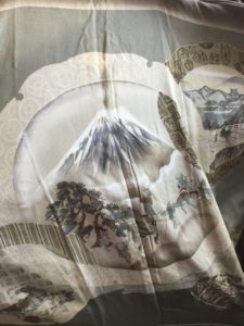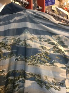 As I reflect on the depictions of Fuji we discovered in our adventures around Tokyo, a picturesque view of the illustrious mountain itself lies before me. We are currently staying at a farmhouse nestled in the tiny village of Nemba. The scenery here is breathtaking and vastly different from the busy streets and tall buildings of Tokyo. Nemba offers the real thing: an up close and personal perspective of Mount Fuji. In our quest to find representations of the mountain in Tokyo, a large portion were typically encountered on consumer products. People can purchase magnets, t-shirts, sake glasses and more that all brandish the iconic triangular shape of Fuji. I was struck by the differences in Fuji portrayals on some of the products for men versus products for women. As we browsed a pop-up shop along the streets of Harajuku selling yukata and kimono, we could only find depictions of Fuji on the yukata for men. It seemed to be singled out as a masculine design to be featured exclusively on the men’s attire rather than women’s. This trend was evident in several other kimono shops.