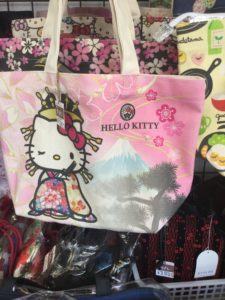 In contrast, for more feminine consumer items such as coin purses and tote bags, Fuji was transformed into cute, colorful patterns. These designs were more geometric and depicted Fuji in a contemporary fashion. One tote bag found in a gift shop in Harajuku even featured the mountain next to a cheerful Hello Kitty. The items portrayed Fuji as a cartoonish symbol rather than the more accurate illustrations of the mountain that we discovered on the men’s traditional yukata. Those Fuji tended to look realistic in terms of coloring and overall landscape. For me, the differences in Fuji representations on products for either men or women were quite striking.