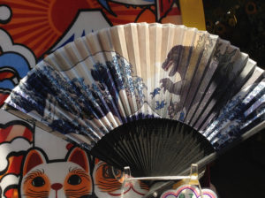 A fan with Hokusai’s Great Wave and Godzilla at a souvenir shop in Asakusa.
