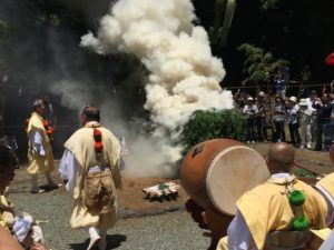 This was made evident to me after watching a Shugendō (mountain worship) ceremony. This event marked the season’s opening of a climbing route up Mt. Fuji. Members of the Shugendō group dressed up in traditional attire and chanted along to the rhythm of conch shell horns and large drums. Many locals came to watch. Among these were a number of primary school children, park rangers, a British ambassador, and a slew of other typical-looking folks, with their cameras at the ready. Towards the end of the ceremony we followed the parade to an intricately stacked tower of wood, the peak adorned with green branches. After a series of symbolic motions of an ax and bow and arrow, meant to dispel malevolent spirits, the heap was set ablaze. The fire emerging up through the wet wood, kept damp as Shugendō members poured water over it, made for quite a show. The smoke and steam intermingled, creating a mesmerizing white eruption that drifted into the thick forest up the slope of the mountain. The movements were all so precise, yet somehow casual. I wondered how long this ritual has been practiced, how many iterations over the years people have witnessed, and how important it still is to welcome an auspicious climbing season.