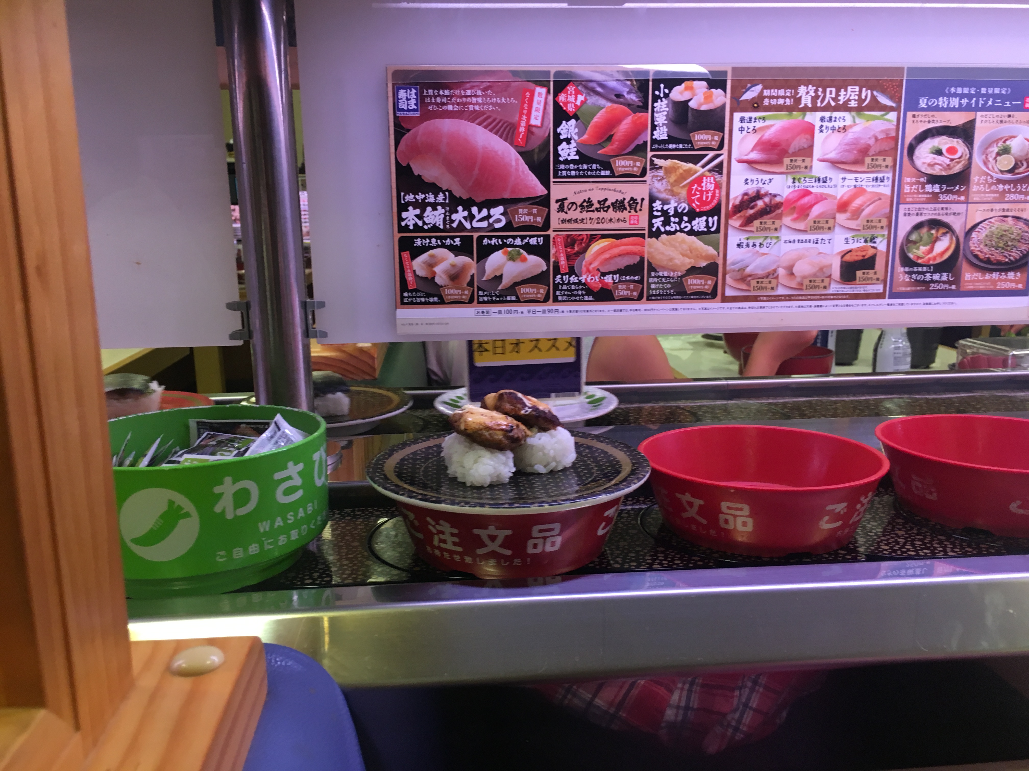 Hamburger sushi at a sushi chain.